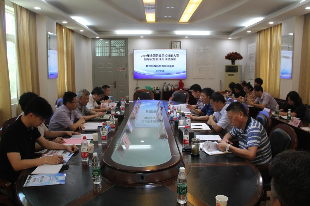 7月28日,全國職業院校技能大賽執委會辦公室主任白漢剛、教育部職業技術教育中心研究所宏觀政策研究室助研房風文、賽項執委會主任王軍偉、賽項執委會副主任張鵬相關專家一行七人來校開展2019年國賽信息安全管理與評估賽項賽後檢查工作。