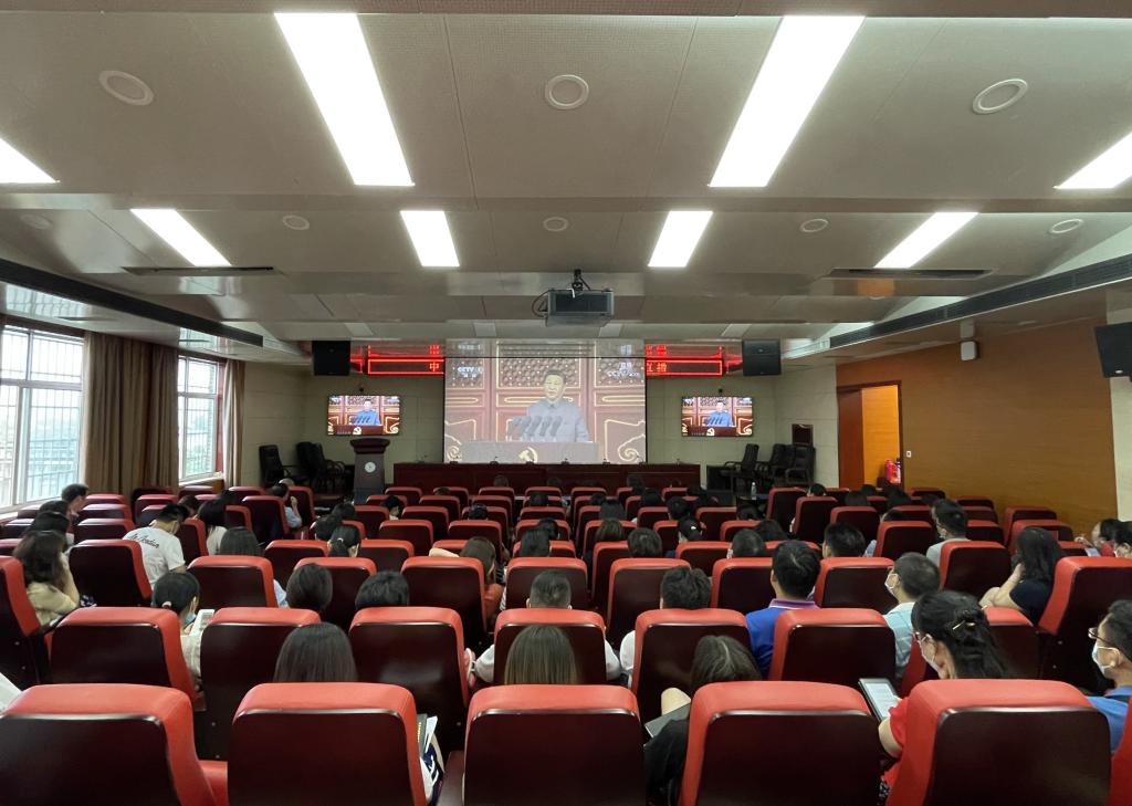 教職工在一号教學樓601報告廳觀看大會直播