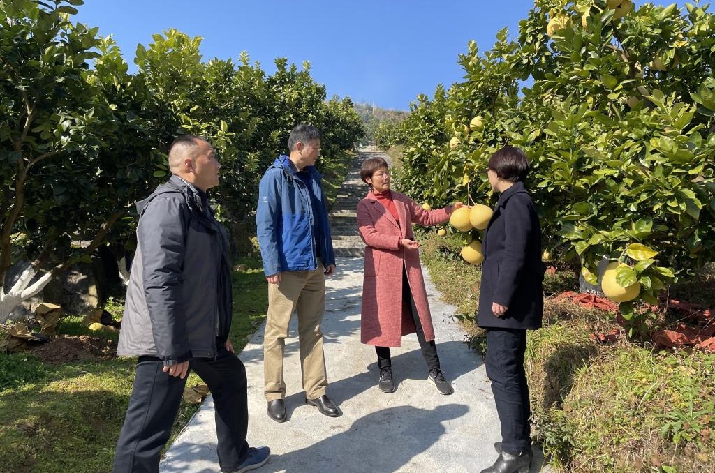 駐村工作隊隊長王紅斌、隊員塗愛萍向曾開紅介紹貢水白柚的種植情況