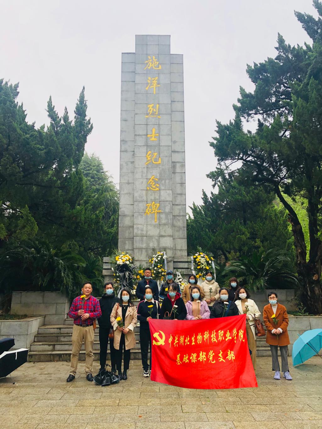 3月31日,臨近清明,細雨紛紛。為傳承革命英烈精神,将英雄精神、紅色基因傳承下去,激發黨員和教師們的革命鬥志,基礎課部黨支部前往施洋烈士陵園,開展“緬懷革命先烈”主題黨日活動,當日下午無課的黨員教師們參加了此次活動。