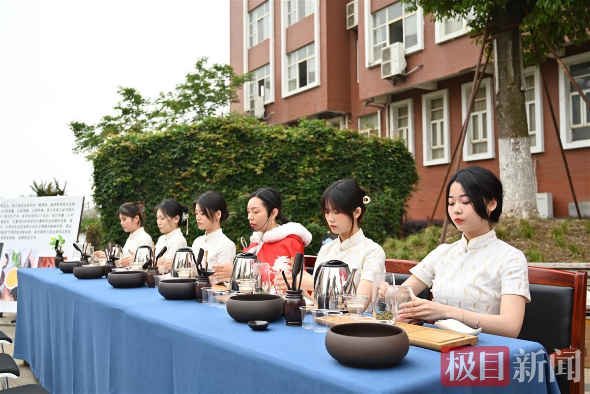 在茶藝展示攤位前,該校幾位女生齊坐一排,拿着茶具為觀衆們做着展示。“入口第一感覺有點澀,而後逐漸很潤。茶的顔色好看清澈,茶香很濃。”現場一名女生在品茶後說道。