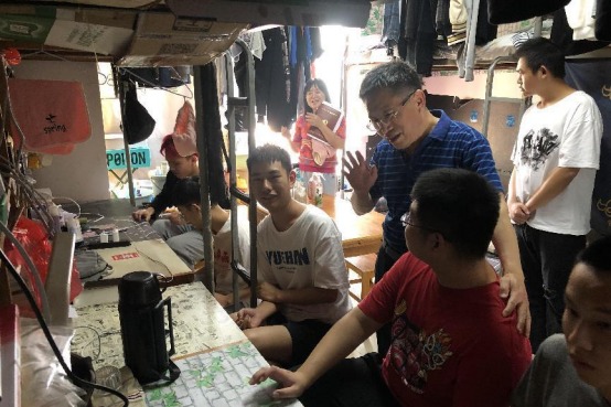 6月15日下午,為更好的了解學生生活情況,他深入該班寝室,開展實地走訪調研,與同學們拉家常,聊生活,聽取意見建議。